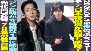 ブログ 【本日のBTS】テテが日本語投稿が話題も削除?ジンが明かす特別な1曲目に感動!光化門衣装70着の舞台裏【まとめ】 🔸生配信番組「ふチタ Vol.27」日時:4月25日(土)21:00〜23:00場所:このチャンネル内容:アルバム「ARIRANG」&ワールドツアーの感想を生電話で!お題:アルバムの感想、ツアーの感想、その興奮の声を生電話でお聞かせください... 2026.04.16 ブログ